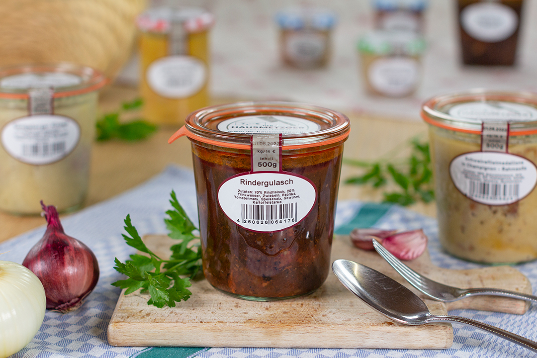 Zutaten: 70% Rindfleisch, 20% Trinkwasser, Zwiebeln, Paprika, Tomatenmark, Speisesalz, Gewürze, Kartoffelstärke, Sellerie